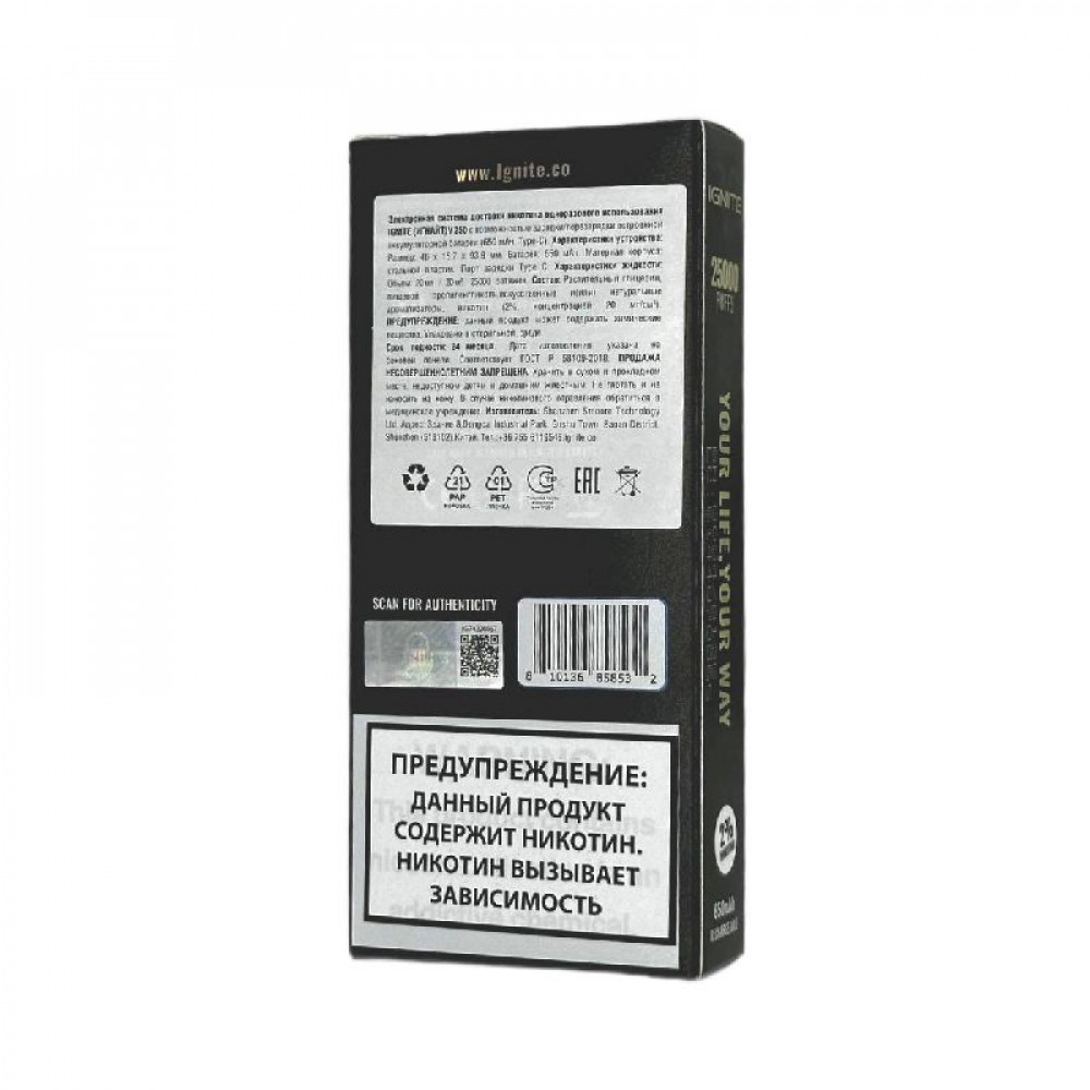 Технические характеристики Электронная сигарета Ignite V250 Gold 25000 - Ice Mint (Ледяная мята)
